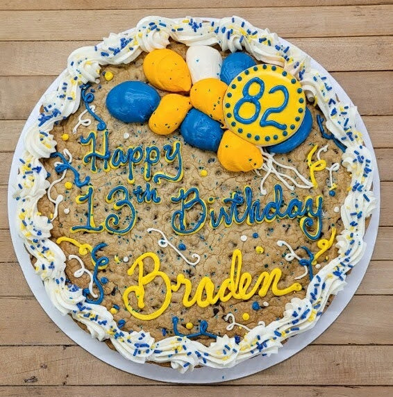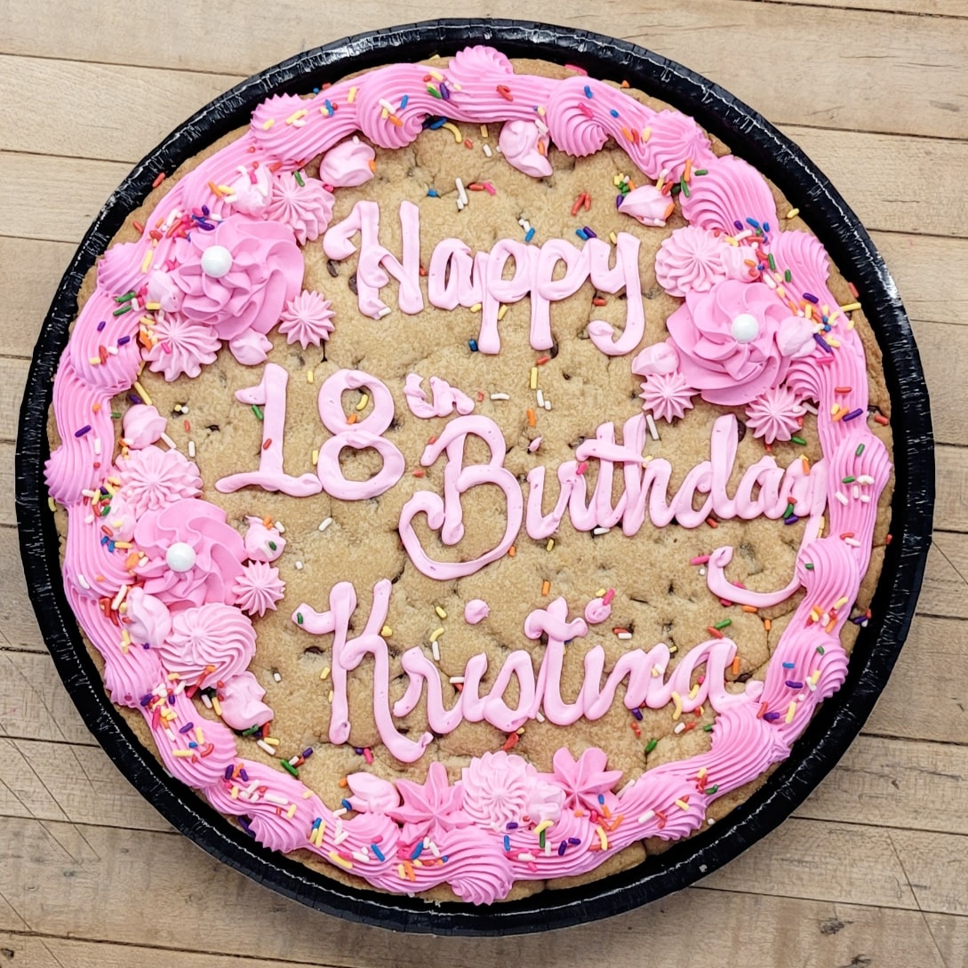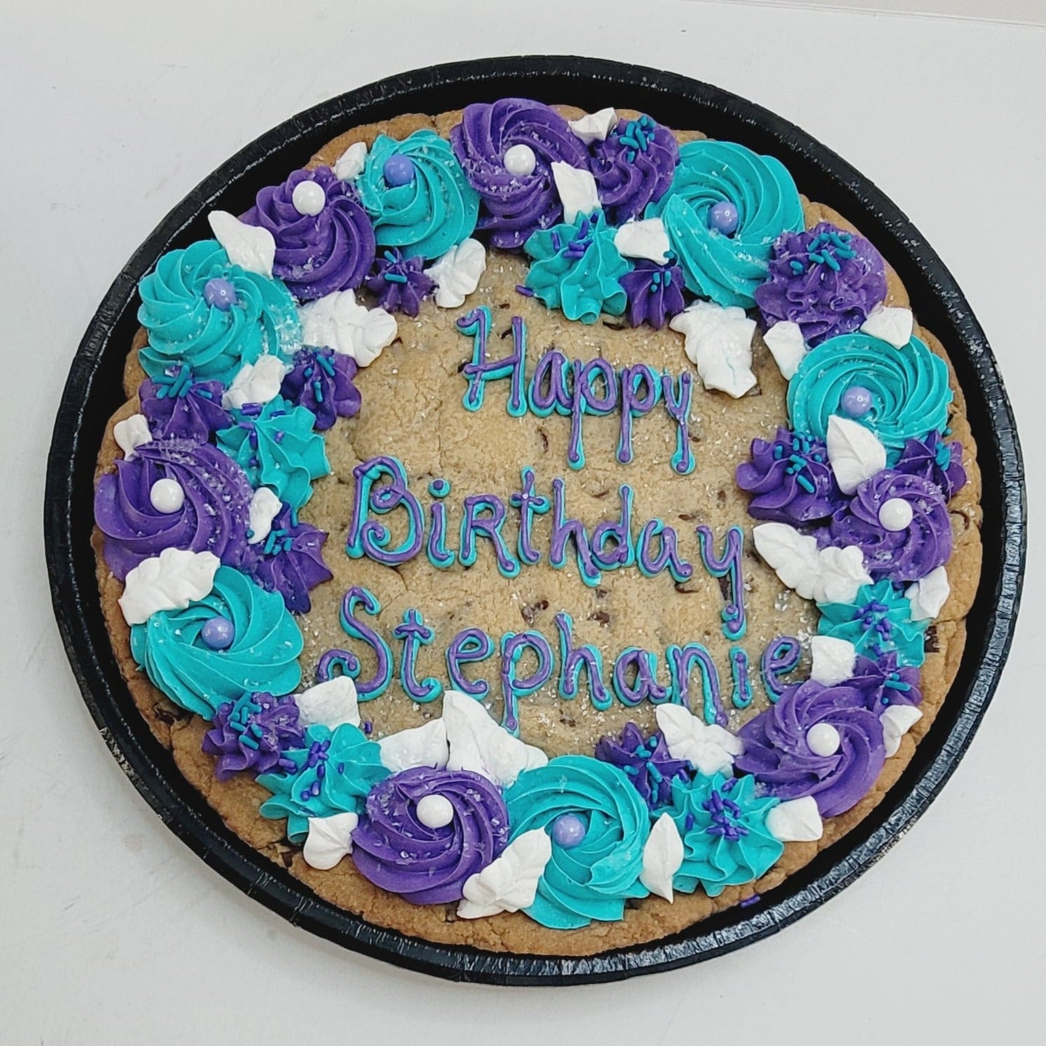 Our delicious cookie doughs custom crafted and decorated into a cookie cake for your special occasion. Our single-layer cakes weigh in at 2 lbs. and serve 12 to 14. You will style your cake with the following options: