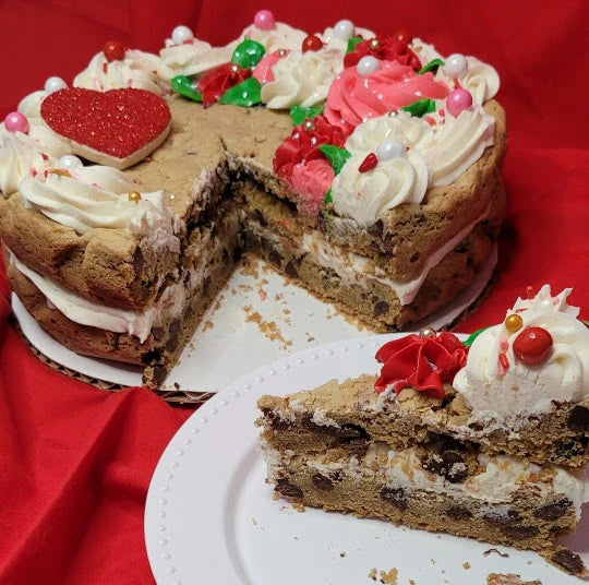 **Note that our Round Sugar Cookie Cake will not be fully frosted. For the Vintage Heart Cake, chocolate frosting will be used for base frosting for double chocolate cookie dough. Vanilla frosting will be used for base frosting when our signature chocolate chip dough is chosen. Decorative piping will be pink/red/Valentine theme colors.